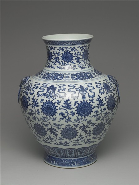 侈口,直頸,豐肩下斂,腹略鼓,圈足外撇,肩部兩側鋪首啣環暗耳。整器白地青花繪飾圖樣,口緣波濤、頸部纏枝番蓮花葉。腹外壁裝飾的紋樣大致可分為三層橫裝飾帶,最上層為八寶,下兩層為盛開的纏枝番蓮花葉,以幾何化之圓「壽」作花心,揭示本器的可能使用脈絡,或用以祝壽。近足處蓮瓣一圈,足牆外飾波濤紋。圈足露胎一圈,足內白地青花書「大清乾隆年製」三行六字篆款。