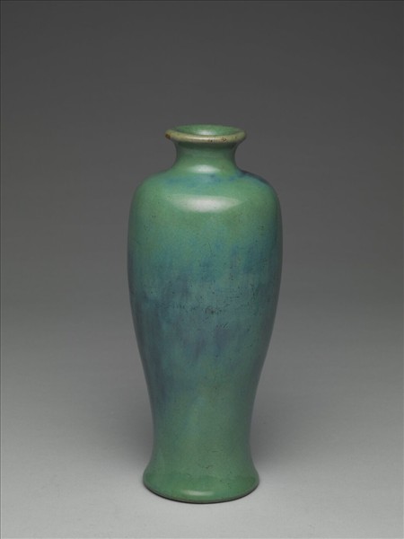 小圓口,外侈有唇,束頸,豐肩,器身長,自肩部略鼓後漸下斂,近足處外馳,平底內凹為足。器外壁施蘋果綠色釉,但是色調不勻,或淺或淡,色深處已如深藍,其間略見流動暈染而色調漸層,有如模仿鈞釉的效果。底外滿塗褐色汁,無款識。