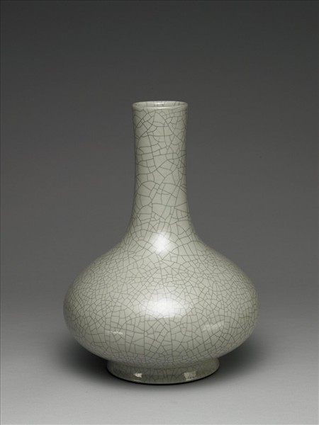 圓口微侈,長直頸,碩腹,圈足。外壁施仿哥釉,色灰白,滿布黑色的冰裂鐵線紋。圈足露胎一圈塗褐色汁,圈足內亦滿施仿哥釉,中央青花書「大清乾隆年製」三行六字篆款。