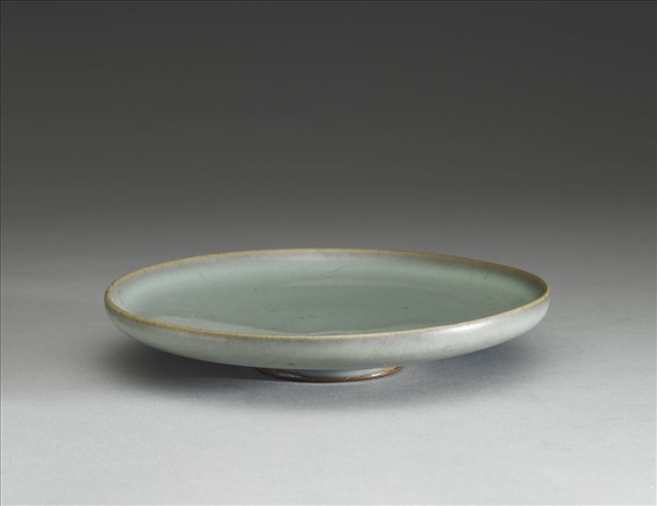斂圓口、淺弧壁,平底並有矮圈足。通體罩施粉青釉,釉質勻細,釉色泛灰,口沿一道米黃邊,外弧壁局部有流釉痕。圈足壁、底緣及內周壁無釉處,皆露土色胎。