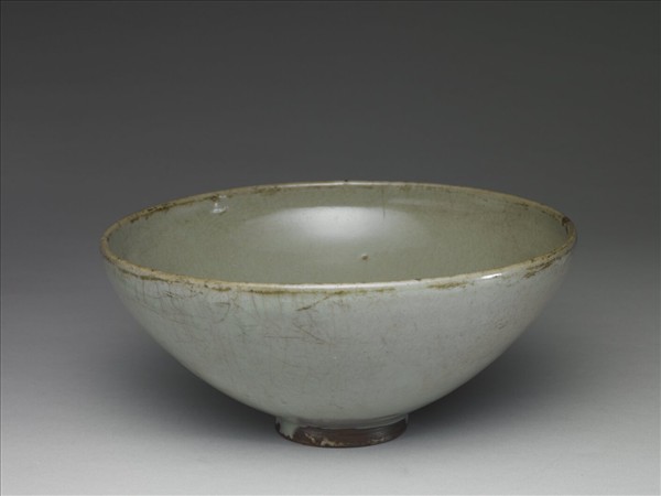 斂圓口,深弧壁,平底,矮圈足。通體罩施天青色釉,因火候不夠,釉色黃灰,口沿一道淺米黃邊,釉表開棕色長紋片,施釉至足際,足壁、底緣與內周壁無釉處,皆露赭土色胎。