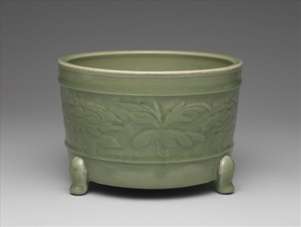 花盆,敞口,深直壁,桶形器身,上寬下斂,平底,口部折沿內伸。外壁中段已劃花菊紋及葉紋為飾,上下各有一道弦紋。底部中央有一孔,外底孔緣及旁邊一側殘留窯渣,另一側有大片無釉處,露出褐色胎土。