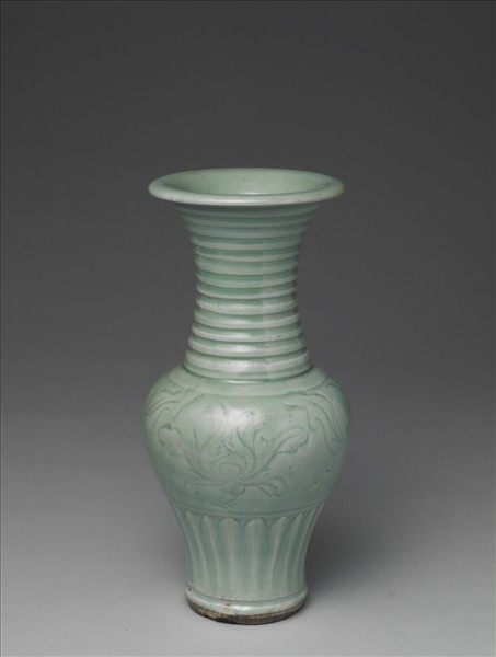 鳳尾瓶,喇叭口,頸闊而長,中段內斂,豐肩,腹上豐下斂,長脛,凹足。全器施青釉,釉汁薄,釉色淺綠溫潤。腹部劃花折枝牡丹,上下各有兩道弦紋為界,頸部滿飾弦紋,脛部飾花瓣紋。足底緣及內壁露胎,塗褐色護胎汁,可見厚重胎骨。