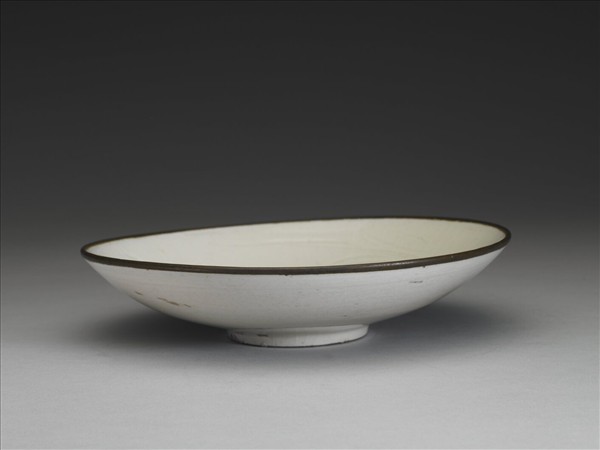 敞口淺碗,圓弧形壁,平底矮圈足。全器施牙白色釉,口緣無釉,鑲銅邊。器內劃飾折枝蘭花。圈足露胎,塗護胎汁呈褐色。