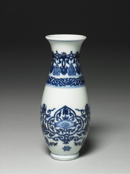 撇口,長頸,溜肩,長腹至底收斂,撇圈足,足沿露胎。口沿及足沿各飾兩道弦紋,頸部飾桃形與菱花鉤連紋,和蕉葉、如意紋相疊。肩部兩道弦紋間,飾雲狀鉤連紋。瓶腹三個如意開光,開光下一朵六瓣花,內以青花暈染如意紋,三邊以蓮瓣飾之,其上有一卍字紋樣。底有「大清乾隆年製」篆書款。
