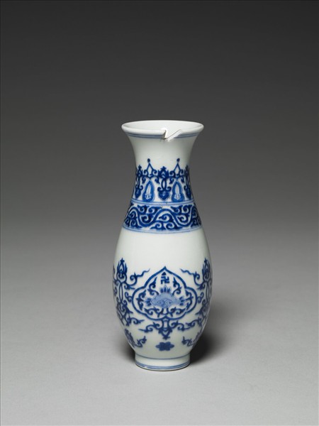 撇口,長頸,溜肩,長腹至底收斂,撇圈足,足沿露胎。口沿及足沿各飾兩道弦紋,頸部飾桃形與菱花鉤連紋,和蕉葉、如意紋相疊。肩部兩道弦紋間,飾雲狀鉤連紋。瓶腹三個如意開光,開光下一朵六瓣花,內以青花暈染如意紋,三邊以蓮瓣飾之,其上有一卍字紋樣。底有「大清乾隆年製」篆書款。