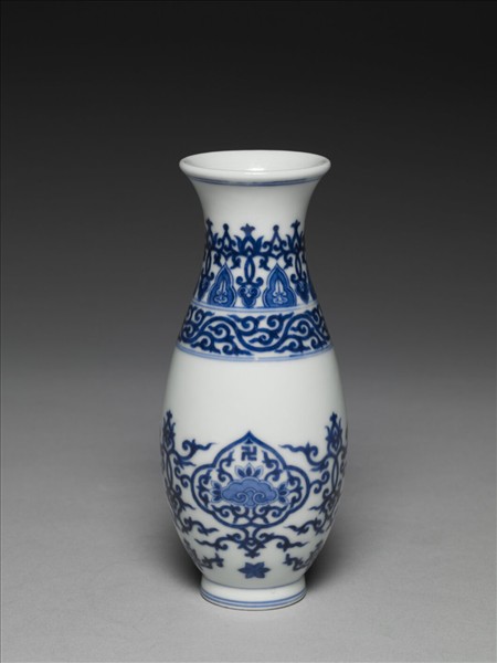 撇口,豎頸,溜肩,長腹至底漸斂,圈足略撇,足沿露胎。口沿及足沿各飾兩道弦紋,頸部以桃形與菱花鉤連紋環狀飾之,和蕉葉、如意紋相疊。肩部兩道弦紋間,飾雲狀鉤連紋。瓶腹三個如意開光,開光下飾一朵六瓣花。開光內以暈染之青花如意為中心,三邊以蓮瓣飾之,正上方有一卍字紋樣,餘則填入鉤連紋。如意開光兩側裝飾相疊之心形及如意鉤連紋。底有「大清乾隆年製」方型篆款。