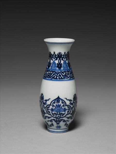 撇口,豎頸,溜肩,長腹至底漸斂,圈足略撇,足沿露胎。口沿及足沿各飾兩道弦紋,頸部以桃形與菱花鉤連紋環狀飾之,和蕉葉、如意紋相疊。肩部兩道弦紋間,飾雲狀鉤連紋。瓶腹三個如意開光,開光下飾一朵六瓣花。開光內以暈染之青花如意為中心,三邊以蓮瓣飾之,正上方有一卍字紋樣,餘則填入鉤連紋。如意開光兩側裝飾相疊之心形及如意鉤連紋。底有「大清乾隆年製」方型篆款。