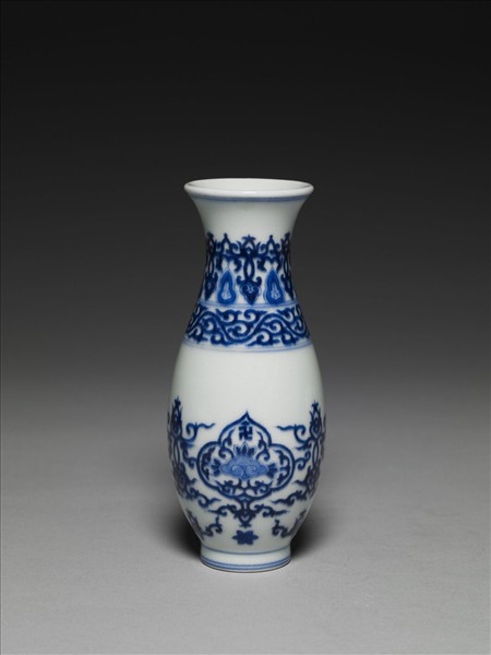 撇口,豎頸,溜肩,長腹至底漸斂,圈足略撇,足沿露胎。口沿及足沿各飾兩道弦紋,頸部以桃形與菱花鉤連紋環狀飾之,和蕉葉、如意紋相疊。肩部兩道弦紋間,飾雲狀鉤連紋。瓶腹三個如意開光,開光下飾一朵六瓣花。開光內以暈染之青花如意為中心,三邊以蓮瓣飾之,正上方有一卍字紋樣,餘則填入鉤連紋。如意開光兩側裝飾相疊之心形及如意鉤連紋。底有「大清乾隆年製」方型篆款。