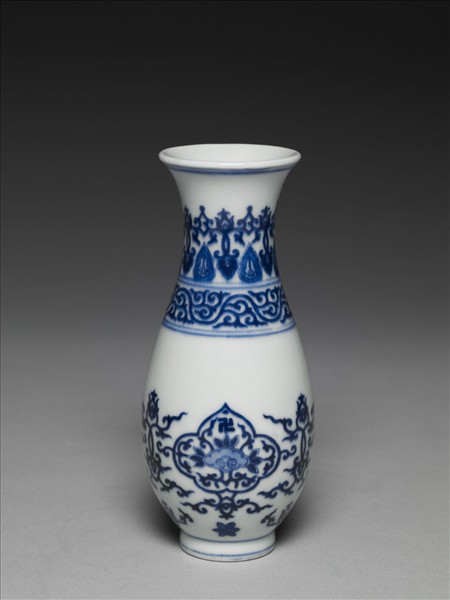 撇口,豎頸,溜肩,長腹至底漸斂,圈足略撇,足沿露胎。口沿及足沿各飾兩道弦紋,頸部以桃形與菱花鉤連紋環狀飾之,和蕉葉、如意紋相疊。肩部兩道弦紋間,飾雲狀鉤連紋。瓶腹三個如意開光,開光下飾一朵六瓣花。開光內以暈染之青花如意為中心,三邊以蓮瓣飾之,正上方有一卍字紋樣,餘則填入鉤連紋。如意開光兩側裝飾相疊之心形及如意鉤連紋。底有「大清乾隆年製」方型篆款。