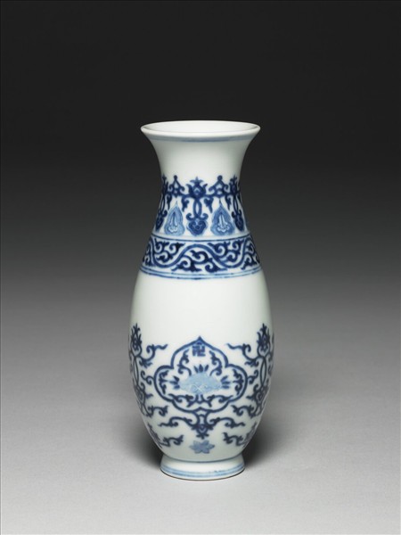 撇口,長頸,溜肩,長腹至底漸斂,圈足略撇,足沿露胎。口沿及足沿各飾兩道弦紋,頸部以桃形與菱花鉤連紋環狀飾之,和蕉葉、如意紋相疊。肩部兩道弦紋間,飾雲狀鉤連紋。瓶腹三個如意開光,開光下飾一朵六瓣花。開光內以雲狀鉤連為錦地,飾以青花暈染之如意,三邊以蓮瓣飾之,其上有一卍字紋樣。如意開光間裝飾相疊之心形及如意鉤連紋。底有方款「大清乾隆年製」。