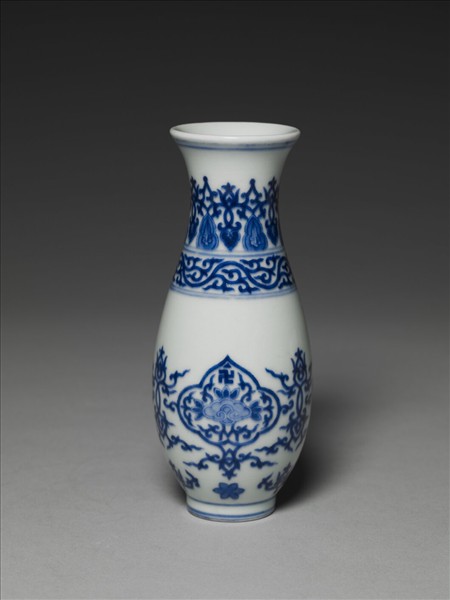 撇口,豎頸,溜肩,長腹至底漸斂,圈足略撇,足沿露胎。口沿及足沿各飾兩道弦紋,頸部以桃形與菱花鉤連紋環狀飾之,和蕉葉、如意紋相疊。肩部兩道弦紋間,飾雲狀鉤連紋。瓶腹三個如意開光,開光下飾一朵六瓣花。開光內以暈染之青花如意為中心,三邊以蓮瓣飾之,正上方有一卍字紋樣,餘則填入鉤連紋。如意開光兩側裝飾相疊之心形及如意鉤連紋。底有「大清乾隆年製」方型篆款。