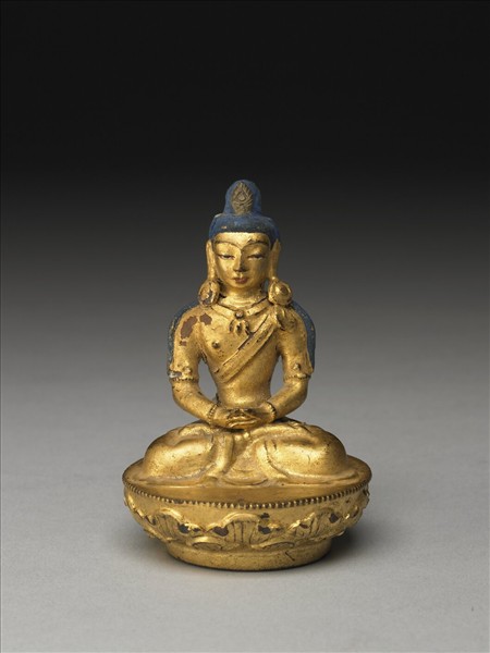 銅鎏金佛坐像,結跏跌坐於蓮座上,手結定印,雙眼半開闔,髮塗有藍色,面容秀氣平和;寬肩細腰,身形圓潤,著右袒式袈裟,以淺浮雕表現袈裟貼身柔軟的質感。置於瓷製藏式塔龕內。