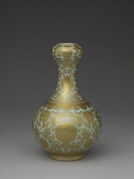 蒜頭瓶,小口鼓起作蒜頭口,長頸,溜肩,梨形圓腹,圈足。全器施淡青釉為地,上以金彩繪製圖紋,口部飾團壽紋及朵雲紋,頸部有番蓮紋與蝙蝠啣盤長紋相間,肩部飾卷草紋及如意雲紋,腹部繪纏枝番蓮紋,中央分列四朵番蓮紋,花心皆寫有一壽字,下緣有一圈蓮瓣紋。圈足外壁繪回紋,足端露胎,塗褐色汁;外底為白地金書「大清嘉慶年製」三行六字篆款。