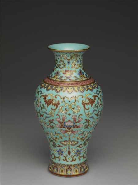 撇口瓶,撇口,豐肩下斂,長腹,圈足內凹。全器藍綠地,圖案以金漆鉤邊填彩。器身繪纏枝番蓮紋,口沿飾一圈如意雲紋,肩頸轉折處繪一圈回紋及如意雲紋,腹下緣繪一圈蓮瓣紋。圈足端露胎呈白色,外底淺藍色,中央有紅書「大清乾隆年製」六字三行篆款。