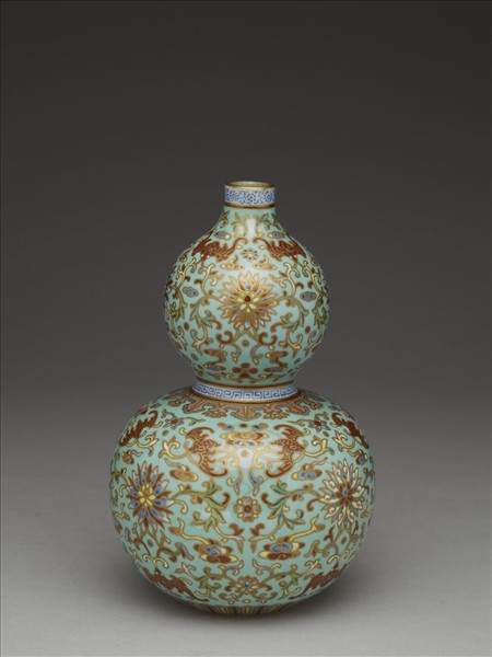 瓶,器作束腰葫蘆形,直口,短頸,束腰,凹足。全器以湖綠色釉為地,上繪洋彩圖案且以金彩鉤邊。以番蓮紋為主紋,周圍環繞紅蝠及雲紋,口沿繪一圈朵花紋,腰部飾回紋及蕉葉紋,腹下飾一圈蓮瓣紋。足底緣露胎,胎色潔白;底施藍彩並以金彩書「大清乾隆年製」六字三行篆款。