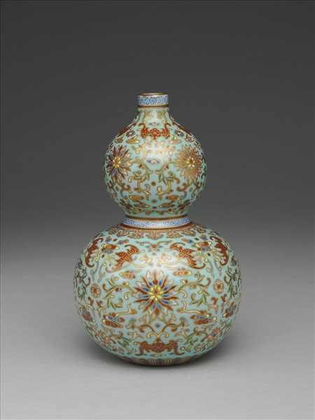 瓶,器作束腰葫蘆形,直口,短頸,束腰,凹足。全器以湖綠色釉為地,上繪洋彩圖案且以金彩勾邊。以番蓮紋為主紋,周圍環繞紅蝠及雲紋,口沿繪一圈朵花紋,腰部飾回紋及蕉葉紋,腹下飾一圈蓮瓣紋。足底緣露胎,胎色潔白;底施藍彩並以金彩書「大清乾隆年製」六字三行篆款。
