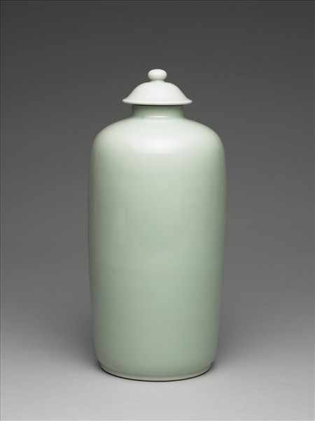 小圓口,短直頸,豐肩,深壁直下,器身呈圓筒狀,圈足,帶圓鈕拱形蓋。通體均施汝釉,呈粉青色,釉色勻淨淡雅,胎骨勻輕,質堅細膩。底青花書「大清雍正年製」六字雙行雙圓框楷款。