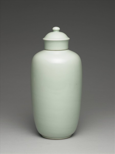 小圓口,束頸,豐肩,深壁直下,器身呈圓筒狀,圈足,帶圓鈕拱形蓋。通體均施汝釉,呈粉青色,釉色勻淨淡雅,胎骨勻輕,質堅細膩。底青花書「大清雍正年製」六字雙行雙圓框楷款。