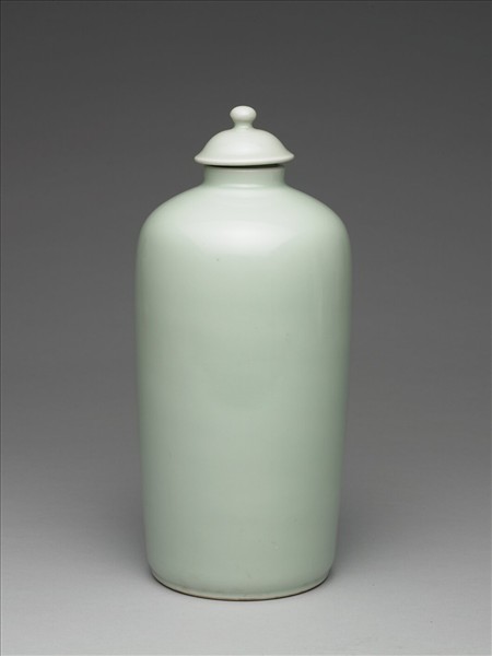 小圓口,短直頸,豐肩,深壁直下,器身呈圓筒狀,圈足,帶圓鈕拱形蓋。通體均施汝釉,呈粉青色,釉色勻淨淡雅,胎骨勻輕,質堅細膩。底青花書「大清雍正年製」六字雙行雙圓框楷款。