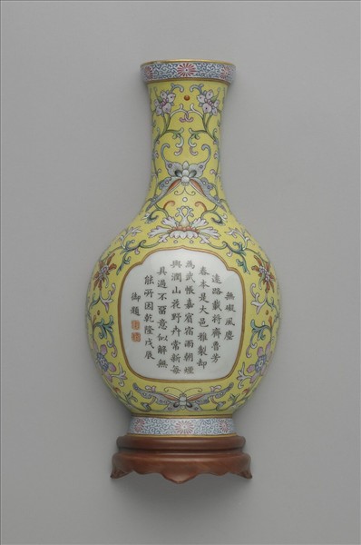 全器如縱剖半器,呈半面帶座瓶形,器背為平面,有孔可穿繫固定於牆面或轎子之內,故有壁瓶或轎瓶之稱,清檔中稱之轎瓶。此瓶外壁黃地錐剔錦上添花,以多彩釉繪圖樣,主要為纏枝番蓮花葉與蝴蝶。腹外壁開光內白地書清高宗御製詩:「無礙風塵遠路,載將齊魯芳春。本是大邑雅製,卻為武帳嘉賓。宿雨朝煙與潤,山花野卉常新。每具過不留意,似解無能所因。」詩末落紅料描繪的「乾」、「隆」印文兩枚。底足內紅釉金彩書「大清乾隆年製」單行橫向篆款。