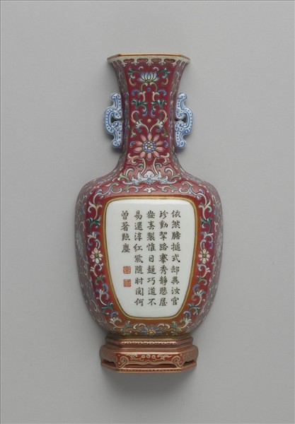 全器如縱剖半器,呈半面帶座雙龍耳瓶形。器背為平面,有孔可穿繫固定於牆面或轎子之內,故有壁瓶或轎瓶之稱,清檔中稱之轎瓶。此瓶外壁紅地多彩釉繪飾圖樣,以纏枝番蓮花葉為裝飾主調。腹外壁開光內白地書清高宗御製詩:「依然膽搥式,卻異汝官珍。動挈路搴秀,靜懸屋盎春。製惟日趨巧,道不易還淳。紅紫隨時閱,何曾著點塵。」詩末落紅料描繪的「乾」、「隆」印文兩枚。底足內紅釉金彩書「乾隆年製」單行橫向篆款。