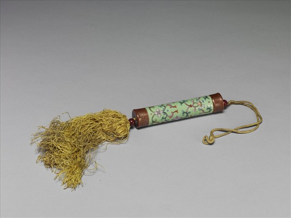 瓷牙籤筒,作圓筒形,中空以裝牙籤,外壁以粉彩彩繪裝飾紋樣。上端為器蓋,具子口,蓋頂及器底繪花瓣紋;器身以草綠釉為地,彩繪纏枝花卉紋。花朵姿態各異,或側面綻放,或正面盛開,其枝葉蔓生分佈的樣貌,兼具幾何構圖特色。使用一黃繩自蓋接貫器底,出為繩結與絲穗,上下各串一紅色瓷珠,可用以固定、調整器蓋的開闔。