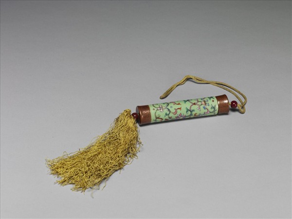 瓷牙籤筒,作圓筒形,中空以裝牙籤,外壁以粉彩彩繪裝飾紋樣。上端為器蓋,具子口,蓋頂及器底繪花瓣紋;器身以草綠釉為地,彩繪纏枝花卉紋。花朵姿態各異,或側面綻放,或正面盛開,其枝葉蔓生分佈的樣貌,兼具幾何構圖特色。使用一黃繩自蓋接貫器底,出為繩結與絲穗,上下各串一紅色瓷珠,可用以固定、調整器蓋的開闔。