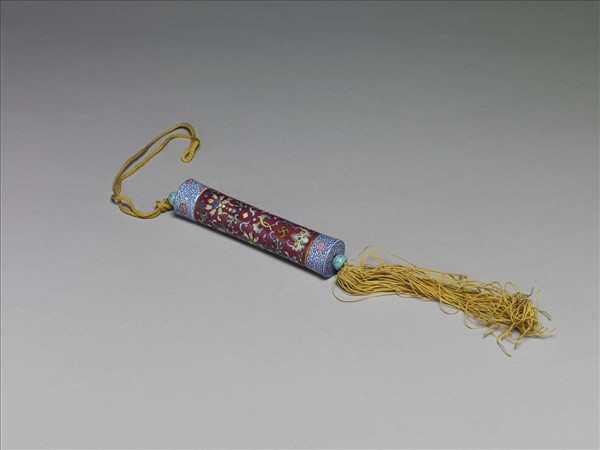 瓷牙籤筒,作圓筒形,中空以裝牙籤,外壁以粉彩彩繪裝飾紋樣。上端為器蓋,具子口,蓋頂及器底繪花瓣紋,器身以紫紅釉為地,彩繪纏枝番蓮紋及蝙蝠啣「卍」字,象徵萬福。使用一黃繩自蓋接貫器底,出為繩結與絲穗,上下各串一松石色瓷珠,可用以固定、調整器蓋的開闔。