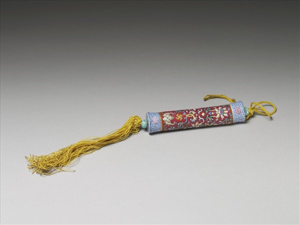 瓷牙籤筒,作圓筒形,中空以裝牙籤,外壁以粉彩彩繪裝飾紋樣。上端為器蓋,具子口,蓋頂及器底繪花瓣紋,器身以紫紅釉為地,彩繪纏枝番蓮紋及蝙蝠啣「卍」字,象徵萬福。使用一黃繩自蓋接貫器底,出為繩結與絲穗,上下各串一松石色瓷珠,可用以固定、調整器蓋的開闔。