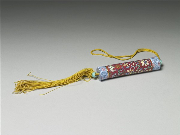 瓷牙籤筒,作圓筒形,中空以裝牙籤,外壁以粉彩彩繪裝飾紋樣。上端為器蓋,具子口,蓋頂及器底繪花瓣紋,器身以紫紅釉為地,彩繪纏枝番蓮紋及蝙蝠啣「卍」字,象徵萬福。使用一黃繩自蓋接貫器底,出為繩結與絲穗,上下各串一松石色瓷珠,可用以固定、調整器蓋的開闔。