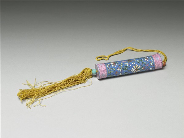 瓷牙籤筒,作圓筒形,中空以裝牙籤,外壁以粉彩彩繪裝飾紋樣。上端為器蓋,具子口,蓋頂及器底繪花瓣紋。器身以藍彩為地,彩繪纏枝番蓮花。使用一黃繩自蓋接貫器底,出為繩結與絲穗,上下各串一紅色及一松石色瓷珠,可用以固定、調整器蓋的開闔。