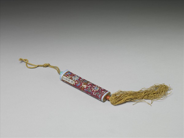 瓷牙籤筒,筒作扁圓形,中空以裝牙籤,外壁以粉彩彩繪裝飾紋樣。上端為器蓋,具子口。上緣繪白地藍色卷草紋,器身以紫紅釉為地,彩繪纏枝番蓮花,右上方有長方形金框題籤,作白地墨書「萬壽無疆」四篆字,器身中間裝飾有金線繞旋與牙白色別子。頂面與底面繪金彩螺旋紋,有如紙卷狀。使用一黃繩自蓋接貫器底,出為繩結與絲穗,上下各串一紅色及一松石色瓷珠,可用以固定、調整器蓋的開闔。