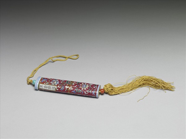 瓷牙籤筒,筒作扁圓形,中空以裝牙籤,外壁以粉彩彩繪裝飾紋樣。上端為器蓋,具子口。上緣繪白地藍色卷草紋,器身以紫紅釉為地,彩繪纏枝番蓮花,右上方有長方形金框題籤,作白地墨書「萬壽無疆」四篆字,器身中間裝飾有金線繞旋與牙白色別子。頂面與底面繪金彩螺旋紋,有如紙卷狀。使用一黃繩自蓋接貫器底,出為繩結與絲穗,上下各串一紅色及一松石色瓷珠,可用以固定、調整器蓋的開闔。