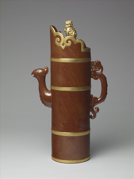 本件瓷胎仿木紋多穆壺,器身呈直筒狀,節分為四,口緣處加僧帽形邊。直腹一側置鳳首形流,另一側則為龍形把手,帶半球形子母口蓋,以蹲踞形獅子為紐。白胎,施仿「拉古里」木紋釉,獅紐、僧帽形口緣及四條分節線施金色釉仿鑲銅凸邊。圈足及足底亦滿釉,無款。