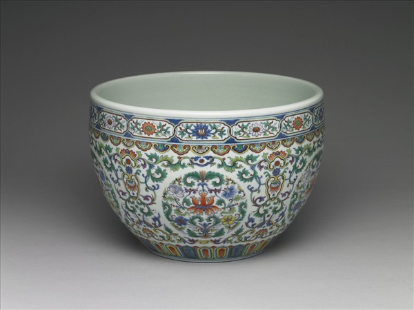 缸,直口,深壁下微斂,淺凹足,平底。以五彩為飾,口沿有一圈藍地如意形開光,內飾各色卷枝花卉紋,下接一圈如意雲紋,腹部分列五組團花,以番蓮紋為中心,旁襯各式折枝花,隙地填以卷葉紋、如意雲紋及朵花紋組成的纏枝紋飾,與團花之間留白,形成開光效果,腹下緣飾一圈蓮瓣紋。器內及足底施釉光素,底部露胎,僅中央有圓形凹入施釉,青花書「大清乾隆年製」六字三行篆款。