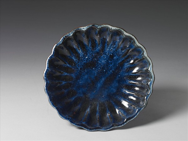 花瓣式盤,盤壁作二十二瓣花形,圈足,平底。全器施鈞釉,以藍色為主,錯雜深淺不等的藍點,口緣處乳濁偏白,且露褐色邊,釉面晶亮反光。足底及盤底外露胎,呈褐色。本器舊稱為「歐窯」,意指宜興仿鈞器,但胎質不類。