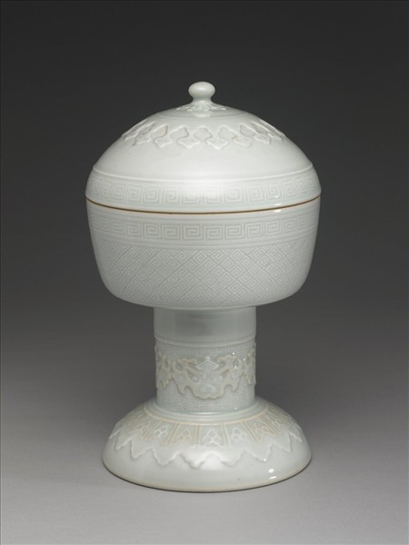 仿古祭祀用豆形器,蓋腹呈盒狀,珠紐,子母口,高圈足。通體施青釉。蓋面紐心印飾菊花紋,外圍一圈弦紋覆印如意裙葉。子母口沿處各印飾一圈回紋,器身襯印雷紋。高足,帶覆座。足身凸起弦紋一道,弦紋下也襯印雷紋,凸飾變形獸面紋,足座敷印花式裙葉,其上凸印魚形紋飾。器底及足底各刻印「大清乾隆年製」六字三行篆款。