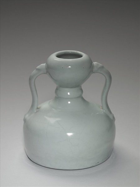 本器外型類似葫蘆,上半部類似蒜頭口,近於豐肩下斂的鉢形。下半部則深壁略外弧,平底內凹成足,其形猶如弧底的覆鉢。上下由一帶凸棱的短頸連接,口肩部兩側各以S形的如意形耳相連,被視為是雍正時期新出現的器形。外壁罩青瓷釉,釉層厚而凝,色偏白。底外施青釉,釉下以青花書「大清雍正年製」三行六字篆款。這一類的器形,亦見有白地青花者。
