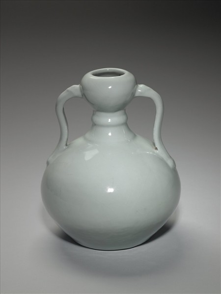 本器外型類似葫蘆,上半部類似蒜頭口,近於豐肩下斂的鉢形。下半部則深壁略外弧,平底內凹成足,其形猶如弧底的覆鉢。上下由一帶凸棱的短頸連接,口肩部兩側各以S形的如意形耳相連,被視為是雍正時期新出現的器形。外壁罩青瓷釉,釉層厚而凝,色偏白,釉表開大紋片。底外施青釉,釉下以青花書「大清雍正年製」三行六字篆款。這一類的器形,亦見有白地青花者。