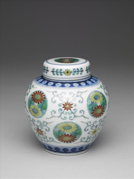 罐,斂圓口,短頸,豐肩,腹部上碩下斂,平底凹足,帶平頂圓蓋。器肩及底邊各繪青花朵花紋飾一周,花心加點紅、黃點紋,罐腹上下各繪飾四組團花,以青花勾勒,五彩繪飾對生的雙朵菊花組成圓形圖案,隙地則飾四出雙鉤圖案式卷葉蓮花紋。蓋面亦飾團菊,蓋周則為四組圖案花卉。底青花書「大清乾隆年製」六字三行篆款。