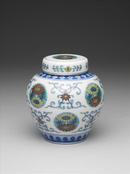 罐,斂圓口,短頸,豐肩,腹部上碩下斂,平底凹足,帶平頂圓蓋。器肩及底邊各繪青花朵花紋飾一周,花心加點紅、黃點紋,罐腹上下各繪飾四組團花,以青花勾勒,五彩繪飾對生的雙朵菊花組成圓形圖案,隙地則飾四出雙鉤圖案式卷葉蓮花紋。蓋面亦飾團菊,蓋周則為四組圖案花卉。底青花書「大清乾隆年製」六字三行篆款。