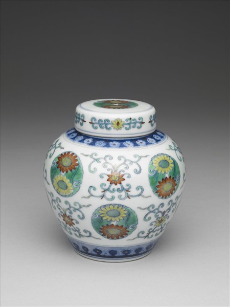 罐,斂圓口,短頸,豐肩,腹部上碩下斂,平底凹足,帶平頂圓蓋。器肩及底邊各繪青花朵花紋飾一周,花心加點紅、黃點紋,罐腹上下各繪飾四組團花,以青花勾勒,五彩繪飾對生的雙朵菊花組成圓形圖案,隙地則飾四出雙鉤圖案式卷葉蓮花紋。蓋面亦飾團菊,蓋周則為四組圖案花卉。底青花書「大清乾隆年製」六字三行篆款。