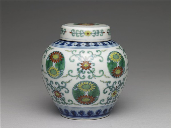 罐,斂圓口,短頸,豐肩,腹部上碩下斂,平底凹足,帶平頂圓蓋。器肩及底邊各繪青花朵花紋飾一周,花心加點紅、黃點紋,罐腹上下各繪飾四組團花,以青花勾勒,五彩繪飾對生的雙朵菊花組成圓形圖案,隙地則飾四出雙鉤圖案式卷葉蓮花紋。蓋面亦飾團菊,蓋周則為四組圖案花卉。底青花書「大清乾隆年製」六字三行篆款。