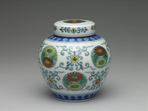 罐,斂圓口,短頸,豐肩,腹部上碩下斂,平底凹足,帶平頂圓蓋。器肩及底邊各繪青花朵花紋飾一周,花心加點紅、黃點紋,罐腹上下各繪飾四組團花,以青花勾勒,五彩繪飾對生的雙朵菊花組成圓形圖案,隙地則飾四出雙鉤圖案式卷葉蓮花紋。蓋面亦飾團菊,蓋周則為四組圖案花卉。底青花書「大清乾隆年製」六字三行篆款。