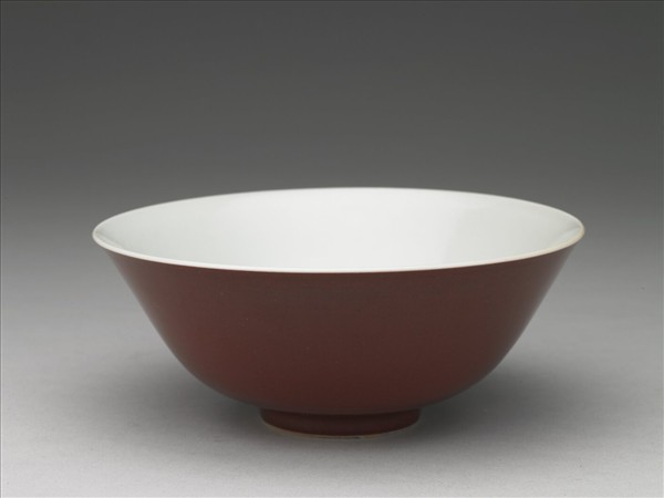 侈口大碗,侈口,口微撇,深壁,平底,圈足。外壁施銅紅釉,呈暗紅色,釉色均勻,器內及外底施透明釉,圈足底緣露胎呈白色,底以青花書「大清雍正年製」六字雙行楷款,外加雙圈。