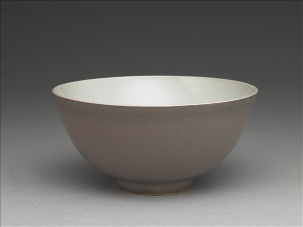 侈口大碗,侈口,深壁,平底,圈足。外壁施銅紅釉,呈灰紅色,釉色均勻,近圈足處有積釉現象,釉色深灰器內及外底施透明釉,圈足底緣露胎呈淡褐色,底以青花書「大清雍正年製」六字雙行楷款,外加雙圈。