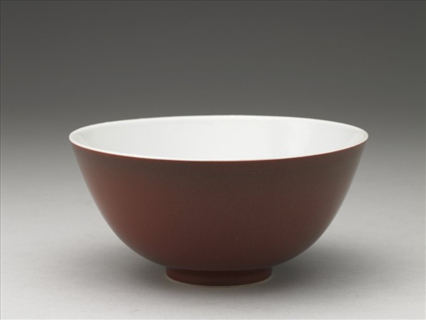 侈口大碗,侈口,深壁,平底,圈足。外壁施銅紅釉,呈暗紅色,釉色均勻,器表有棕眼,器內及外底施透明釉,圈足底緣露胎呈白色,底以青花書「大清雍正年製」六字雙行楷款,外加雙圈。