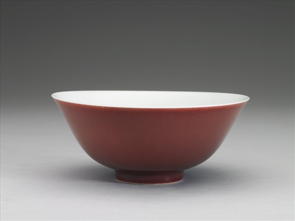 侈口大碗,侈口微撇,深壁,平底,圈足。外壁施銅紅釉,呈深紅色,釉色均勻,有些許白色苔點,器內及外底施透明釉,圈足底緣露胎呈白色,底以青花書「大清雍正年製」六字雙行楷款,外加雙圈。