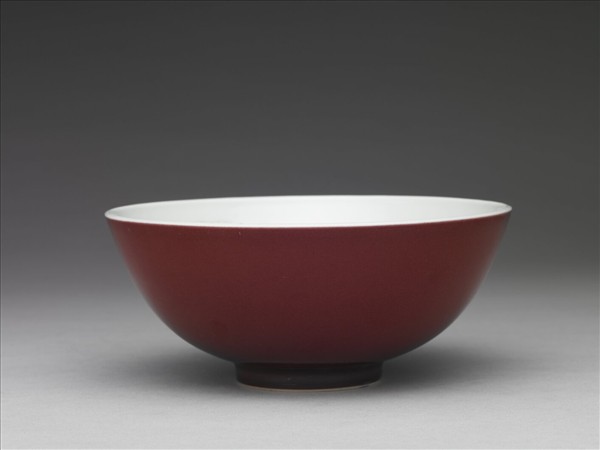 侈口大碗,侈口,深壁,平底,圈足。外壁施銅紅釉,呈深紅色,釉色均勻,器內及外底施透明釉,圈足底端露胎呈白色,底以青花書「大清雍正年製」六字雙行楷款,外加雙圈。